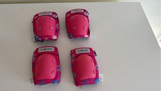 Set de protecciones para niña de la marca NKS. - Talla M. 6-8 años - Incluye muñequeras, rodilleras y coderas. - Color rosa y azul. - Cierre de velcro.