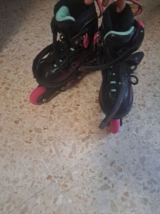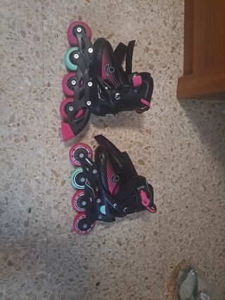 Patines en línea ajustables para niños, ideales para edades entre 6 y 10 años aproximadamente. Son de color negro con detalles en rosa y verde menta. - Patines de bota, fáciles de poner y quitar. - Talla ajustable del 29 al 32. - En buen estado, listos para usar.