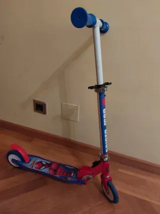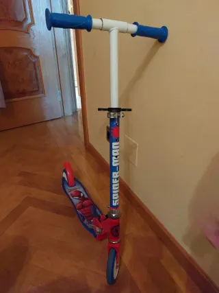 Patinete infantil de dos ruedas con diseño de Spiderman. Es plegable para facilitar su guardado o su transporte. Se entrega en su caja como se ve en la foto. Se ha usado bien poco, pero tiene algún pequeño roce en el manillar