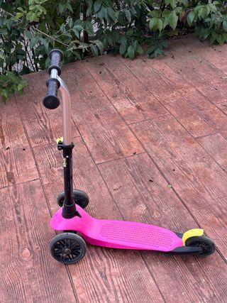 Patinete infantil de tres ruedas, ideal para los más pequeños. Su diseño es ligero y fácil de manejar. Vendo por falta de uso. Ideal para niñ@s de 80 cm a 1,15 m. - Color rosa. - Tres ruedas para mayor estabilidad. - Manillar ajustable. - Soporte rosa desmontable e intercambiable por otro color, comprando la pieza en decathlon.