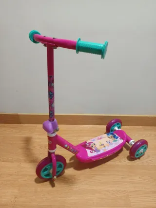 Patinete de tres ruedas con diseño de Shimmer & Shine, ideal para los más pequeños. Perfecto estado. - Color rosa y turquesa. - Puños de goma para mejor agarre. - Plataforma decorada con personajes. - Ruedas de color turquesa. Ideal para niñ@s de entre 2 y 4 años