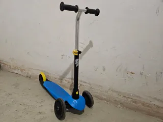 Patinete infantil de tres ruedas de Decathlon, ideal para los más pequeños. Incluye casco protector. - Diseño de tres ruedas para mayor estabilidad. - Color azul con detalles divertidos. - Altura del manillar ajustable.