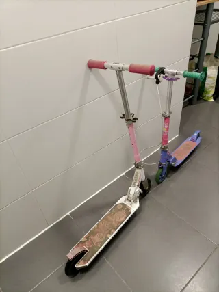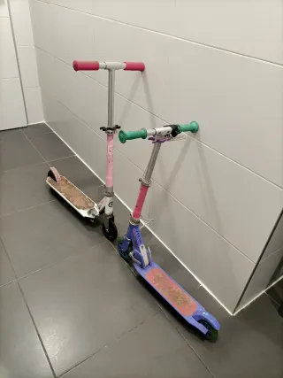 Se venden 2 patinetes infantiles, uno rosa y otro morado. Marca: OXELO (Decathlon). - Patinete rosa más grande. - Patinete morado más pequeño y con freno en el manillar. Han sido utilizados por 2 niñas.