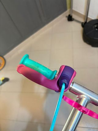 Patinete infantil Oxelo - Diseño moderno y ligero. - Color gris y rosa. - Rueda delantera con una pequeña raja pero no impide el funcionamiento.