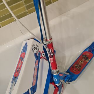 Vendo patinete marca MGP modelo Marvel Spiderman Extreme Scooter Freestyle. Base estriada, amplia de 4'' con lija de Spiderman y freno blitz en composito. Manillar en forma de T y en acero de una sola pieza, empuñaduras "squit" y un collar de sujeción en aleación. Horquilla IHC igualmente en acero y juego de dirección sellada sin rosca. Aunque es un patinete pro, ha sido usado siempre por un niño pequeño (fue un regalo...) y nunca se ha usado acrobáticamente. Solo tiene desgaste del uso de paseo. Se nota el desgaste de la base.