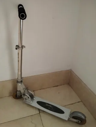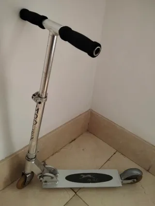 Patinete infantil de aluminio, ideal para niños. Se encuentra en buen estado. - Estructura de aluminio. - Manillar con empuñaduras rojas. - Ruedas de goma. - Diseño sencillo y ligero. - Plegable.