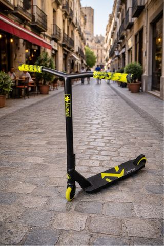 Patinete Sawyer bikes de estilo libre, ideal para niños de 6 a 10 años. Diseñado para la diversión y el aprendizaje. - Manillar con puños de colores llamativos. - Base con diseño gráfico en amarillo. - Ruedas de color amarillo.