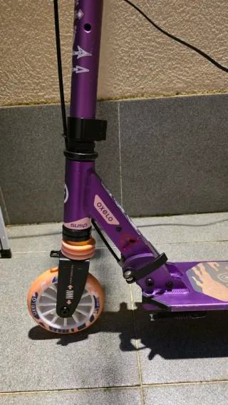 Patinete de dos ruedas de la marca Oxelo en color morado. - Para niños entre 6 y 8 años. - Altura de manillar ajustable. - Dos ruedas de 125 mm - 2 frenos, uno en el manillar y otro en el pie. - Plegable, con correa para colgarlo al hombro y transportarlo. - Amortiguación delantera