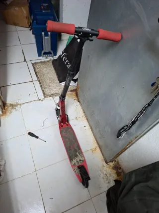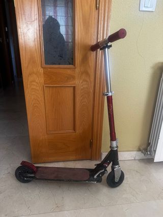 Patinete Oxelo de color rojo, diseñado para niños (Decathlon). - Manillar ajustable en altura. - Ruedas para un desplazamiento suave. - Plataforma antideslizante. - Hasta 100 kg de peso Ideal para llevar al colegio y candarlo. Tiene un agujero para pasar el candado en la parte delantera. Bastante usado, de ahí su precio. Era plegable, pero se rompió la pestaña y ya no se puede plegar.