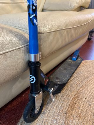 Patinete de la marca Oxelo con un diseño moderno y ruedas de color azul. Esta bien conservado apenas se ha usado, por no usarlo el papel que cubre donde se apoyan los pies se esta despegando pero no es por el uso. - Ruedas de color azul. - Manillar ajustable. - Plegable para facilitar su transporte.