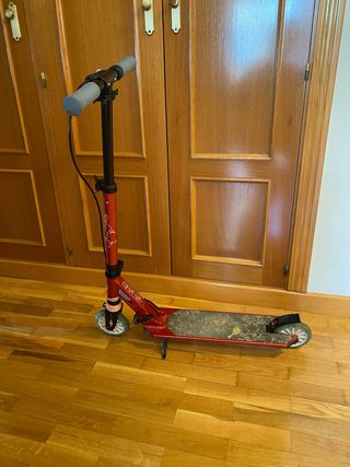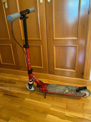 Patinete Oxelo de color rojo, ideal para desplazamientos urbanos. - Freno integrado en el manillar. - Ruedas de 200mm. - Plataforma antideslizante. - Excelente estado conservación. - Pata de apoyo para aparcar. - Precio de nuevo 69 euros. - Plegable.