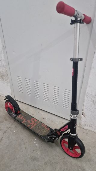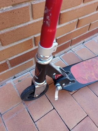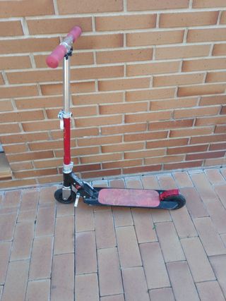 Patinete plegable para niños de 6 a 9 años (máximo 100kg.). Color rojo-negro. Tiene marcas de uso pero está completo y funcionando correctamente.