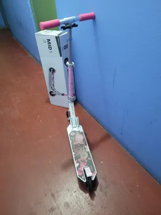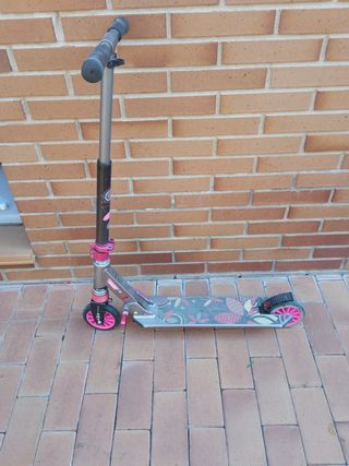 Patinete infantil Oxelo, ideal para niños y niñas. Es plegable para facilitar su transporte y almacenamiento. El manillar es ajustable en altura y en la parte trasera dispone de un freno funcional. El material es resistente y las ruedas son de goma con un nucleo de plastico. Tiene decoraciones florales rosas en la base antideslizante. Perfecto para paseos en el parque o trayectos cortos al aire libre. Tal y como se ve en las fotos tiene evidentes signos de uso pero se conserva bien