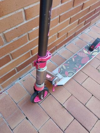 Patinete Oxelo para niños Ideal para peques de hasta 140 cm. En muy buen estado, con diseño llamativo en rosa y negro. Manillar ajustable con empuñaduras cómodas. Base con dibujo colorido y correa para transportarlo fácilmente. Perfecto para paseos seguros y divertidos. ¡Listo para rodar! - Sistema de suspensión. - Ruedas resistentes. - Plegable para facilitar su transporte.