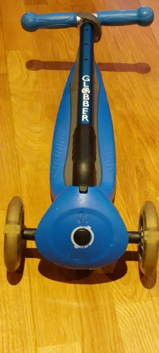 Patinete Globber de color azul, diseñado para ser plegable. Cuenta con luces y sistema de bloqueo.