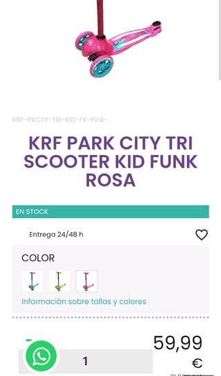 Patinete infantil KRF Park City Tri Scooter Kid Funk en estado como nuevo, sin uso y en color rosa. Incorpora sistema patentado de control de giro, estructura con marco interior reforzado en acero y barra T anodizada ajustable (57×24 cm) con mangos TPR suaves. Plataforma sólida de PP con doble agarre (29,5×12 cm). Ruedas delanteras PU 121×24 mm y trasera 80×30 mm, dureza 82A, rodamientos ABEC-5 y freno trasero de PP. Dispone de bloqueo ajustable y sistema de plegado para guardarlo fácilmente. Recomendado de 3 a 6 años, soporta hasta 50 kg y cumple normativa EN71.