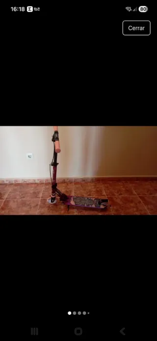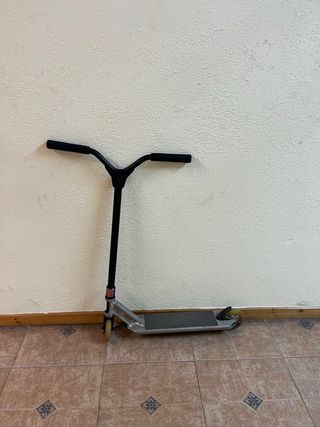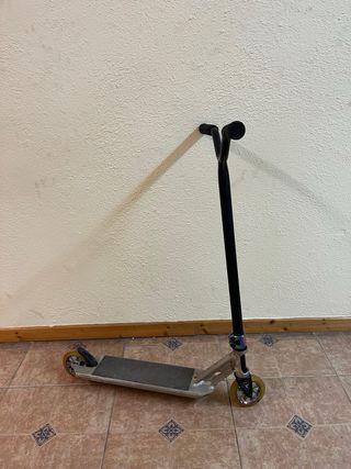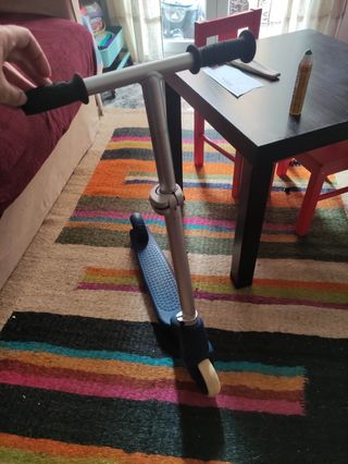 Tiene uso pero está en perfectas condiciones, manguitos cambiados y en muy buen estado. Rodamientos perfectos, y el patinete no tiene ninguna holgura. No me acuerdo del modelo exacto pero es del Decathlon de los que valen 80 euros, no es el básico. Patinete scooter de estilo libre de la marca Oxelo. Diseñado para trucos y maniobras. - Manillar negro con puños de colores. - Plataforma plateada. - Ruedas con detalles azules.