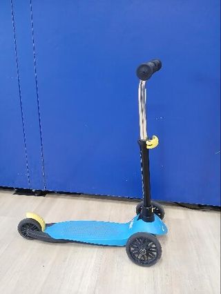 Patinete scooter en color azul, con diseño deportivo + oxelo amarillo en muy buen estado y poco uso. - Manillar negro ajustable. - Ruedas de goma. - Plataforma antideslizante.
