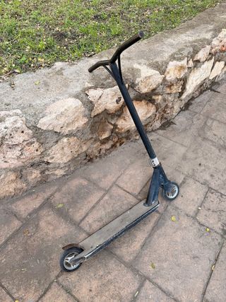 Patinete tipo scooter, ideal para desplazamientos urbanos o trucos. - Manillar negro. - Plataforma gris. - Ruedas pequeñas.