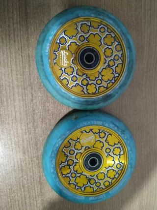 Dos ruedas para patinete de la marca Lucky. - Diseño con tréboles dorados y fondo azul. - Incluye rodamientos.