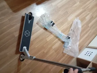 Patinete stunt usado, en buen estado. Únicamente deben cambiarse los manguitos - Tabla: Ambush 4.5 - Freno: Phoenix - Manillar: 9 transport - Fork: 9 transport - Clamp: District - Color: Negro y gris - Ruedas: Metalcore