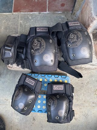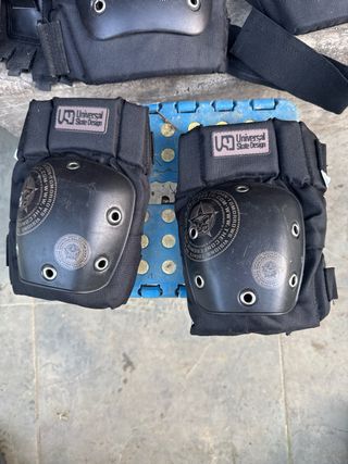 Set de protecciones para patinaje de la marca Universal Skate Design. - Incluye rodilleras y coderas. - Diseño en color negro. - Cierre de velcro ajustable. Están muy bien, a excepción de algún rice y el desgarro de la foto.