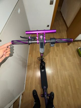 Patinete eléctrico Xiaomi M365 con un llamativo acabado morado. - Manillar con puños de goma. - Freno de mano. - Pantalla digital central. - Ruedas de 10 pulgadas - Base antideslizante negra -En buen estado -Tiene holgura en el mástil -Velocidad:25-30km -Autonomía:25-30km -NO INCLUYE CARGADOR 🔌 -La luz delantera y trasera no van -Extensor de batería interna y externa -Los extensores son solo de estética ya q no lleva baterías extras PRECIO NEGOCIABLE