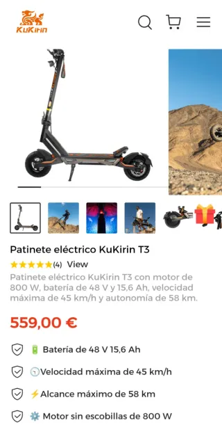 NO ENVÍO Patinete eléctrico KuKirin T3 con motor de 800 W y batería de 48 V. Es como el kukirin G2 pero con más par y un poco menos de velocidad punta. Trae unas luces integradas que se pueden poner en marcha y parece un árbol de Navidad. Es nuevo y tiene 27 km. No tiene homologación DGT. Viene limitado a 25km/h pero se puede deslimitar. - Batería de 48 V 15,6 Ah. - Limitado a 25 km/h pero puede alcanzar 45-50. - Velocidad máxima de 45 km/h. - Alcance máximo de 58 km. - Motor sin escobillas de 800 W. Otras marcas similares Dualtron AUSOM kukirin G2 G3 G4 Xiaomi Cecotec Segway Ninebot SmartGyro NIU scooter