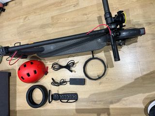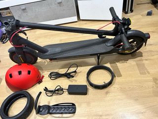 Se vende patinete eléctrico Xiaomi junto con varios accesorios. - Soporte para colgar en pared. - Patinete eléctrico plegable. - Casco de protección rojo. - Cargador y cables. - Rueda de repuesto. - Accesorio para llevar el mobil