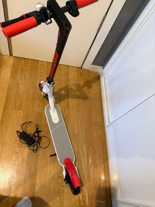 Patinete eléctrico Xiaomi en buen estado. Cuenta con amortiguación para un paseo más cómodo y ruedas antipinchazo. Se incluyen ruedas de repuesto. - Color: Negro y rojo. - Manillar con puños texturizados. - Luz frontal LED azul. - Freno de mano.