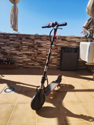 Patinete eléctrico con diseño deportivo. - Manillar negro con detalles blancos. - Ruedas de 10 pulgadas nuevas(80€) con guardabarros rojos nuevos (35€). - Plataforma gris antideslizante. Sin cargador( no lo encuentro).