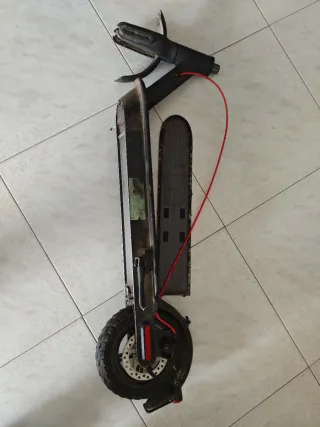 Patinete Xiaomi para piezas de repuesto. Ideal para reparar o aprovechar componentes. - Rueda trasera con freno de disco. - Guardabarros negro. - Cableado rojo visible. Las dos Ruedas son macizas