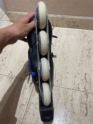 Patines en línea con diseño deportivo en azul y blanco. Perfectos para iniciarse en el patinaje. - Cierre de velcro y hebilla. - Ruedas de poliuretano. - Marco de aluminio. Tienen algún arañazo por el uso Precio no negociable