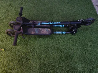 Patinete de tres ruedas, muy poco uso, en color azul, diseñado para niños. Presenta un manillar ajustable y una plataforma con dibujos. - Color azul vibrante. - Tres ruedas para mayor estabilidad. - Manillar con empuñaduras cómodas. - Plataforma decorada con personajes infantiles.