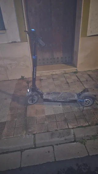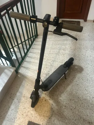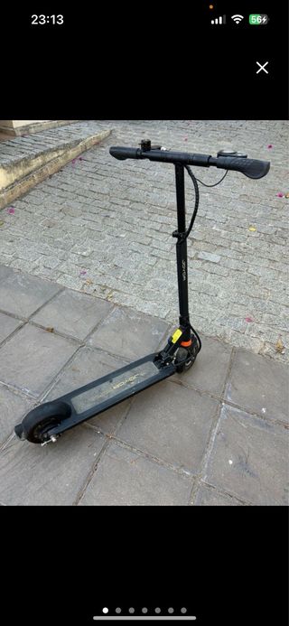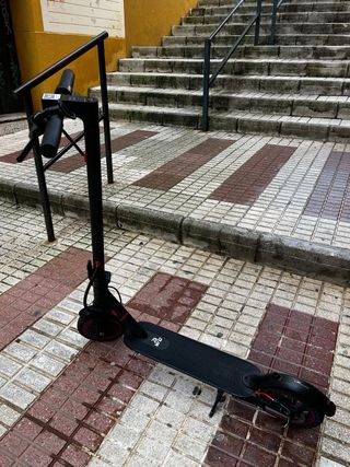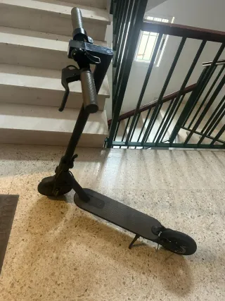 Patinete eléctrico de color negro, ideal para desplazamientos urbanos. Está en buen estado y funciona bien - Manillar con puños grises. - Freno manual en el manillar. - Rueda delantera visible.. Despecfectos : - Como pueden. Ver la imagen en la parte de el foco está un poco abollado . - el timbre esta un poco roto .