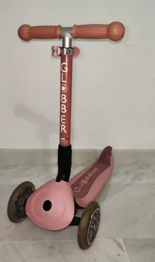 Patinete de tres ruedas de la marca Globber en color rosa. - Manillar ajustable. - Plegable para reducir espacio en almacenaje y transporte. - Ruedas delanteras con luces.
