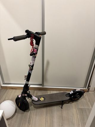Patinete eléctrico de color negro, ideal para desplazamientos urbanos. Cuenta con una bolsa de transporte frontal. - Diseño plegable. - Bolsa de almacenamiento negra. - Ruedas negras con detalles rojos. Prácticamente a estrenar, casco de regalo con luz