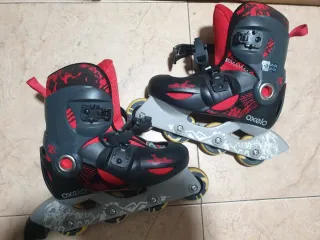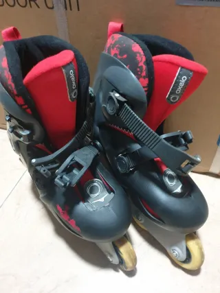 Se venden patines en línea Oxelo en color negro, rojo y gris. Perfectos para iniciarse en el patinaje. - Talla: 32-34 (UE) / 20-21.5 (CM). - Cierre con velcro y hebilla. - Ruedas de 70mm. - Diseño con estampado gráfico.