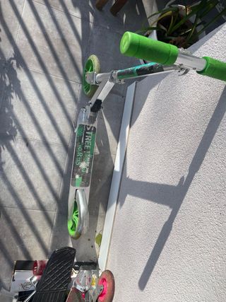 Patinete de la marca STREET, modelo 200. - Manillar y puños de color verde. - Ruedas de color verde. - Plataforma plateada.