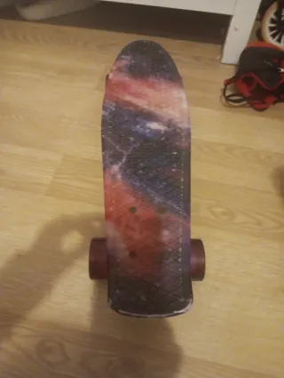 Patineta estilo Penny Board con un diseño de galaxia vibrante. Ideal para desplazamientos cortos y trucos básicos. - Diseño de galaxia - Ruedas resistentes - Tabla con agarre