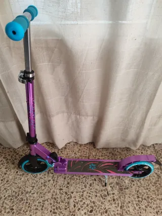 Patinete infantil con un diseño llamativo. - Color morado con detalles en azul. - Ruedas de color azul. - Manillar ajustable.