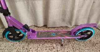Patinete de color morado con detalles en azul y blanco. - Manillar ajustable. - Ruedas de 125mm. - Freno trasero. - Plegable para fácil transporte.