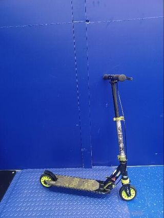 Patinete marca Tijuana, diseñado para acrobacias. - Puños de color verde con diseño. - Base y manillar de metal. - Ruedas negras. - Micro suspensión delantera - Plegable