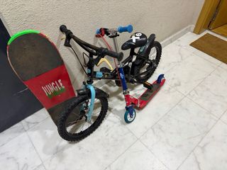 Lote de tres artículos de movilidad infantil. - Bicicleta infantil. - Patinete. - Monopatín.