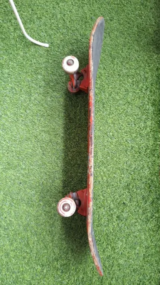 Patinete con un diseño llamativo y un acabado desgastado que le da un toque único. - Tabla de madera con pintura roja y detalles de otros colores. - Ejes y ruedas de patinaje. - Superficie con marcas de uso y desgaste. -precio negociable