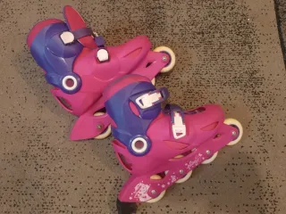 Set de patines en línea para niños, con un diseño divertido en color rosa y morado. - Cierre de velcro y hebilla. - Decoración de estrellas y mariposas. -Bota acolchada. - Talla 32/34 . -Medida 20/21'5 cm