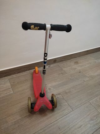 Patinete de dos ruedas, ideal para niños y niñas. Su diseño combina un acabado plateado con detalles en rosa. -Manilla de freno - Manillar ajustable. - Ruedas de goma. - Plataforma antideslizante. Está prácticamente nuevo, tiene muy poco uso
