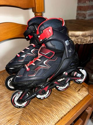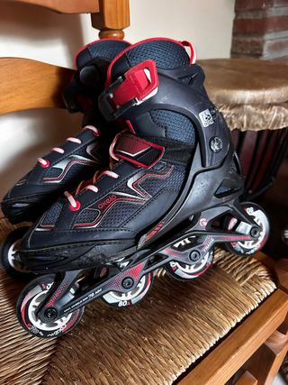 Patines en línea Oxelo en color negro con detalles en rojo. Perfectos para desplazamientos urbanos o para iniciarse en el patinaje. - Cierre con velcro y hebilla. - Ruedas de 76 mm. - Marco resistente. Tiene muy pocas marcas de uso. Los vendo porque no los utilizo ya. PRECIO ALGO NEGOCIABLE.