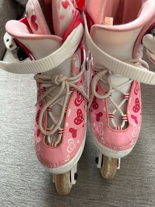 Patines en línea infantiles con diseño de Princesas Disney. Están en buen estado, aunque presentan algunas señales de uso. - Dos patines rosas con ruedas. - Decorados con flores y el logo de Disney. - Ideales para principiantes.