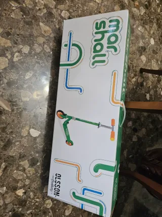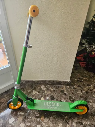 Patinete infantil de color verde con ruedas amarillas. - Manillar ajustable. - Plataforma antideslizante con logo. - Ruedas de goma. Con muy poco uso